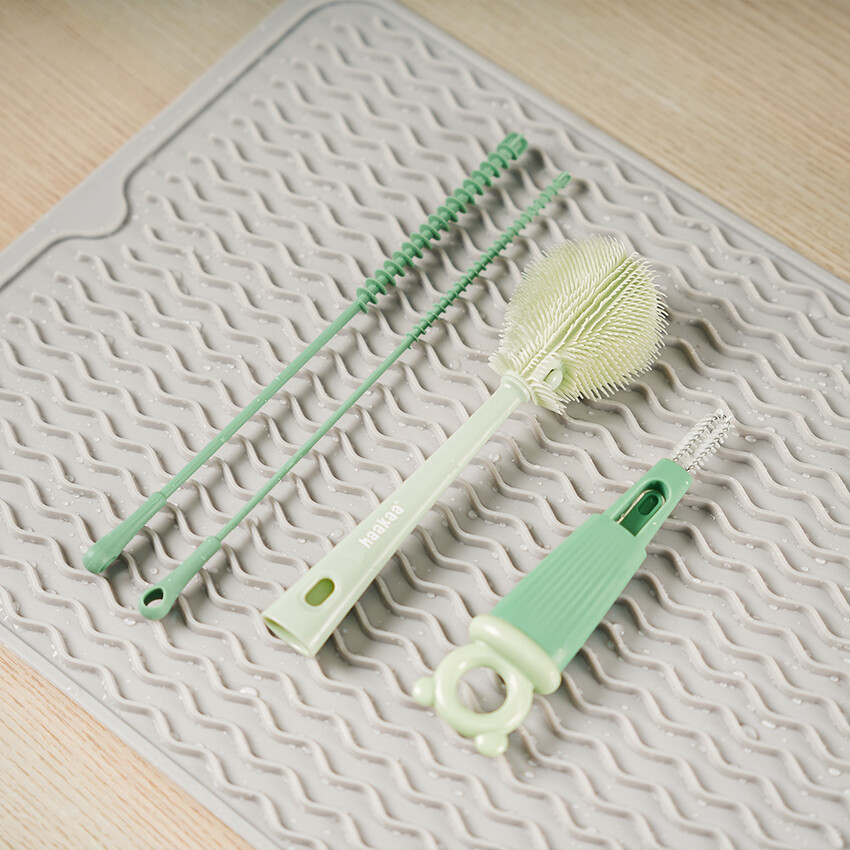 Clean and care for your maternity and baby gear with Haakaa's 5-in-1 Cleaning Brush Set! The star of this set is the multipurpose detachable brush,With three different-sized heads and flexible bristles to provide effective 360° cleaning,all your items will be left fresh and ready for reuse. The bottle brush head bends up to 90° and the bristle pad is removable for extra hygienic convenience. Long,dense,and tough-yet-soft bristles compress to fit and thoroughly clean most containers,reaching even tight corners. The handle features a firm angled edge for easy removal of stubborn residues. The twisted nylon brush is ideal for reaching inner surfaces and smaller gaps. Finally,the U-shaped brush features bristles on both inner surfaces to fit over container edges and grooves to clean stubborn nasties,Alongside this amazing brush are two silicone tube brushes for detailed cleaning of narrow items such as straws or colostrum collectors! Each brush features a hanging hook for convenient storage and helping with mould prevention.